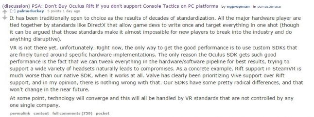 “[PC game development] has been traditionally open to choice as the results of decades of standardization. All the major hardware player are tied together by standards like DirectX that allow game devs to write once and target everything in one shot,” wrote Luckey in a comment that was later removed (screenshot below.)