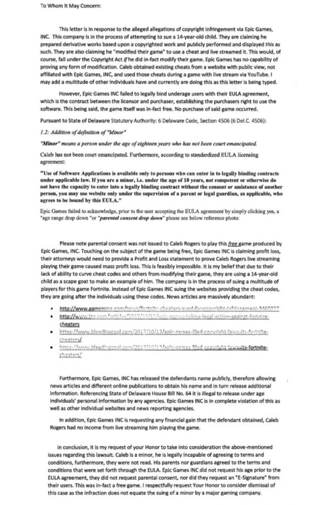 In the letter (shown below) she claims that Fortnite’s terms require parental consent for minors, but explains that she never gave her consent.