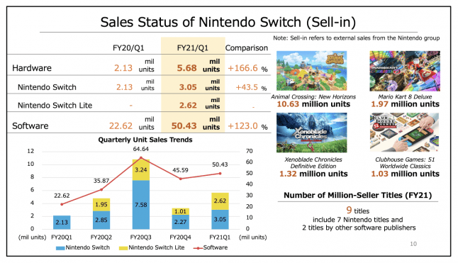Nintendo Switch software also performed well, with total software sales increasing by 123 percent year-on-year to 50.43 million units. New titles like Xenoblade Chronicles Definitive Edition and Clubhouse Games: 51 Worldwide Classics helped bump those numbers, selling 1.32 million units and 1.03 million units respectively.