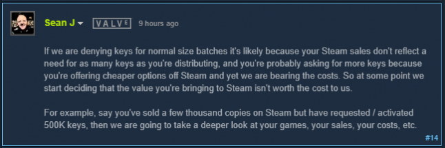 “If we are denying keys for normal size batches it’s likely because your Steam sales don’t reflect a need for as many keys as you’re distributing,” said Jenkin in the private Steamworks developer portal.